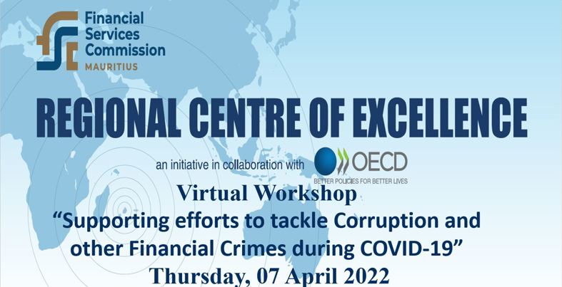 The Regional Centre of Excellence (“RCE”) of the Financial Services Commission, Mauritius (“FSC”) in collaboration with the Organisation for Economic Co-operation and Development (“OECD”), has the pleasure to invite you or a representative(s) from your organisation to attend a virtual workshop on “Supporting efforts to tackle Corruption and other Financial Crimes during COVID-19” on Thursday, 07 April 2022 at 13.30 - 16.30hrs (Mauritius Time).